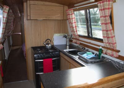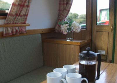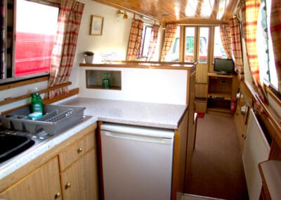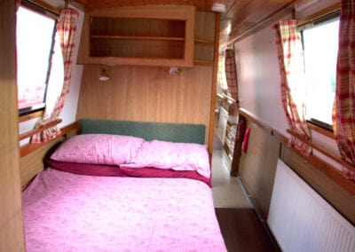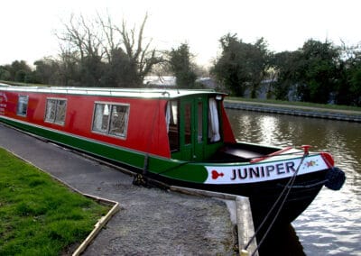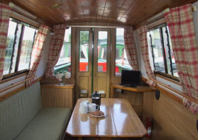 Juniper is one of our our super luxury narrowboat holiday hire boats, with ample space for 4 or 5 people and full carpeting in the saloon and bedrooms. The saloon area has comfortable seating, a freestanding table and a colour T.V. and DVD Player. The bathroom has a small bath to supplement the shower. There is a fixed interior – sprung double bed in the middle cabin and in the rear cabin there are two interior sprung singles which can convert to a second fixed double.